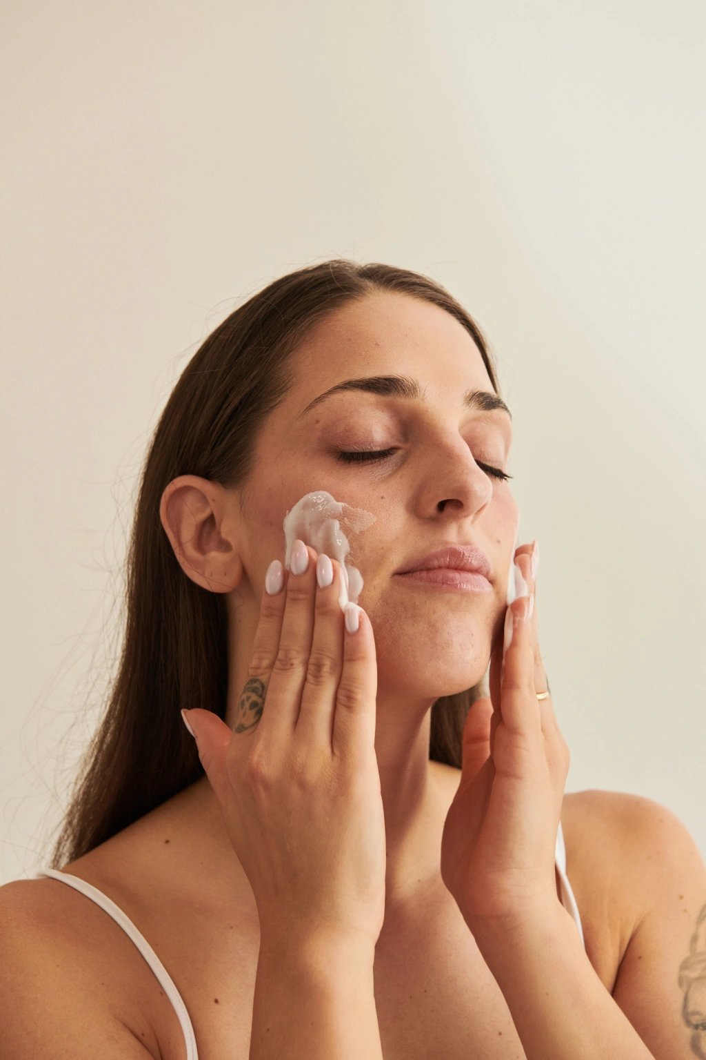 Krém nanášajte od spodnej časti krku smerom nahor k brade. Tento smer pomáha podporiť pevnejší vzhľad pokožky a predchádza jej ochabovaniu.