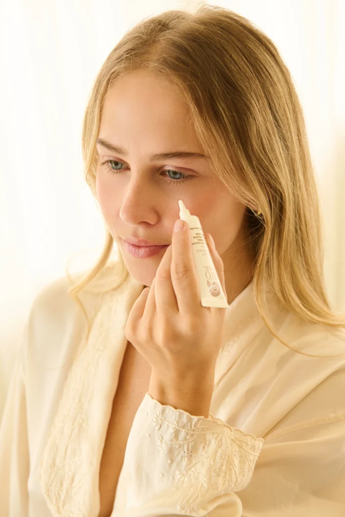 Krém aplikujte jemnými ťahmi od stredu tváre smerom nahor a do strán. Podporíte tak prirodzené spevnenie pokožky a lepšie vstrebávanie látok.
